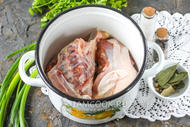 Промоем набор или другие части курицы, вырежем жилы, пленки и выложим в кастрюлю или казан.