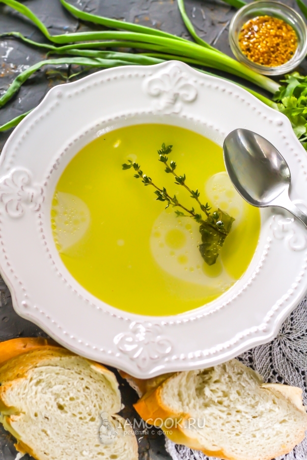 Нальем часть бульона из курицы в глубокую тарелку, украсим и подадим к столу с сухариками или гренками на пробу.