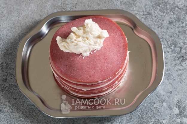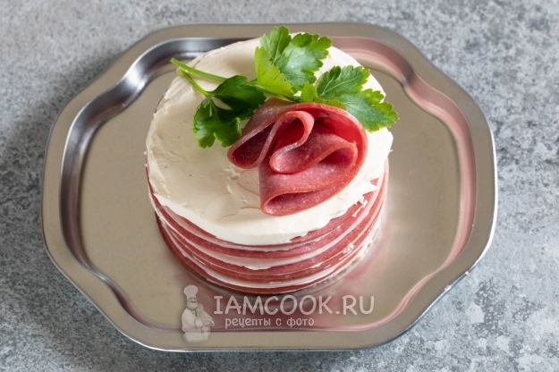 Оставив одну шайбу колбасы для декора (У нас торт или не торт? Если торт - необходима розочка!), размазываем весь остаток сырного крема по поверхности торта из колбасы.