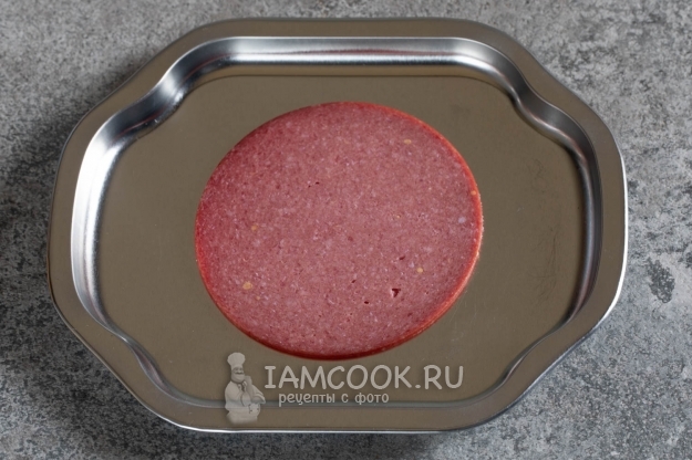 На плоскодонную сервировочную тарелку кладем шайбу колбасы.