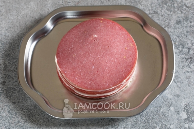 Человек не понимает того, что торт из колбасы мне сделать значительно проще, чем сладкий. Была бы под рукой вот такая колбасная нарезка, как на фотографии (т.е. абсолютно ровные шайбы колбасы с одинаковой окружностью), а дальше - вообще не проблема!