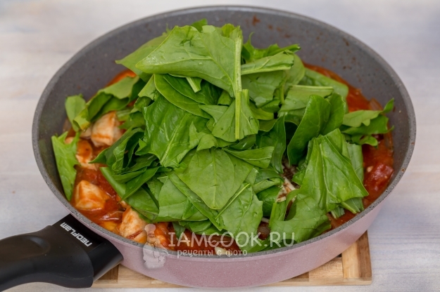 Так как у меня листья шпината были крупные, я просто порвала их. Если у вас шпинат с маленькими листочками, кладите прям так.