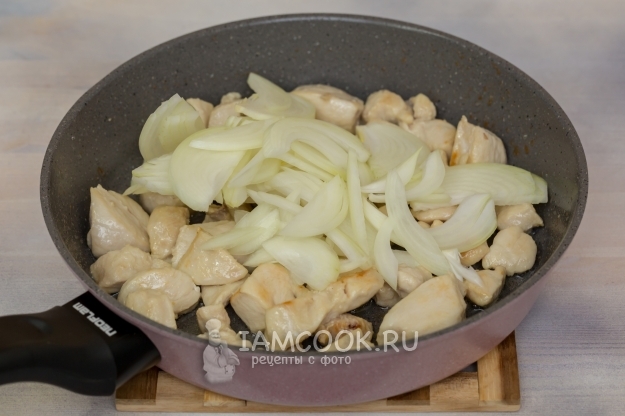 Куриное мясо нарезать произвольно, обжарить на небольшом количестве подсолнечного масла.