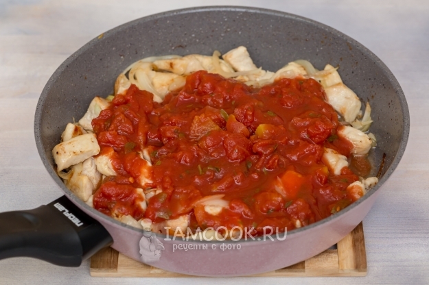 Затем очередь томатов в собственном соку. Прогреть на среднем огне пару минут.