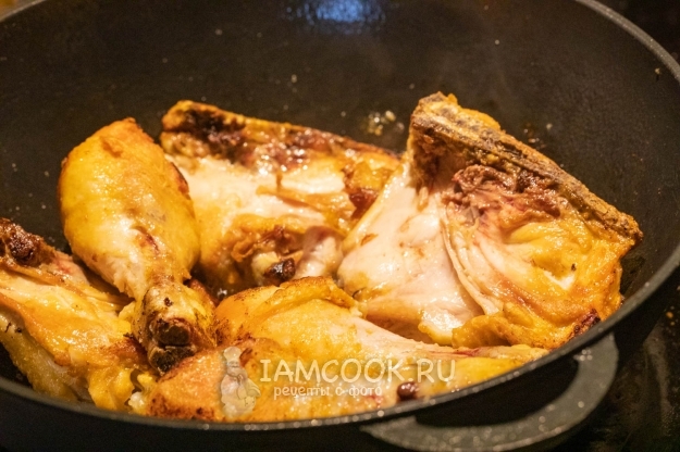 Обжариваем разрезанные куриные окорочка в растительном масле со всех сторон на сильном огне.