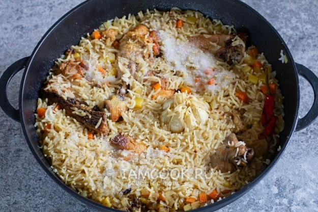 На электрической плите конфорку после этого выключаем и даём плову дойти ещё 10 минут на остаточном тепле. На газовой плите убавляем огонь на минимум. Солим плов из окорочков в самом конце приготовления, непосредственно перед размешиванием и подачей.