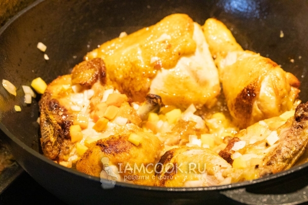 Когда окорочка со всех сторон зазолотились, забрасываем в казан морковь и лук и продолжаем жарить овощи вместе с курятиной на сильном огне до прозрачности или золотистости лука.