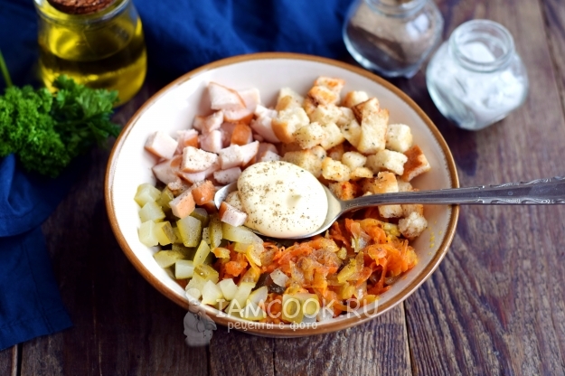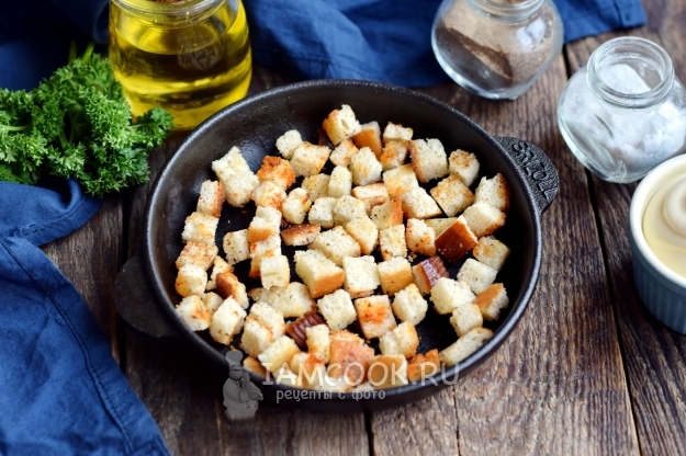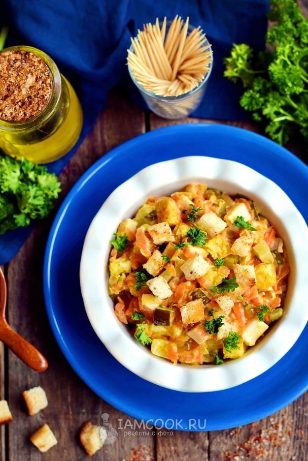 Салат подавайте на стол сразу после приготовления без предварительной пропитки. Присыпьте блюдо свежей измельченной петрушкой и второй порцией хрустящих сухариков.