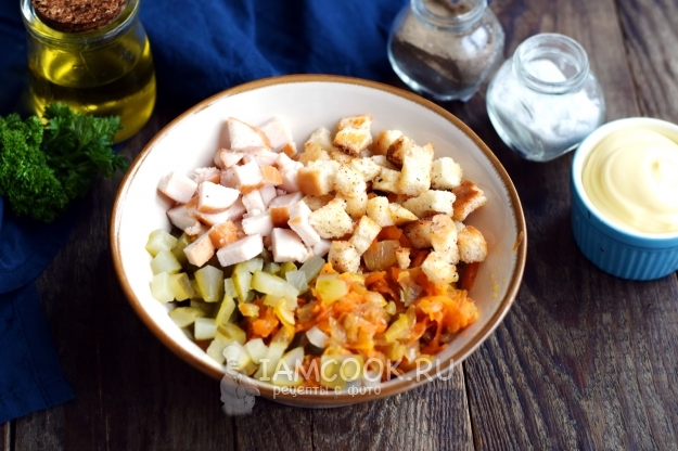 Пассерованные овощи, огурец и половину сухариков сгрузите в одну емкость, добавьте к ним копченую курицу, заранее нарезанную кубиком.