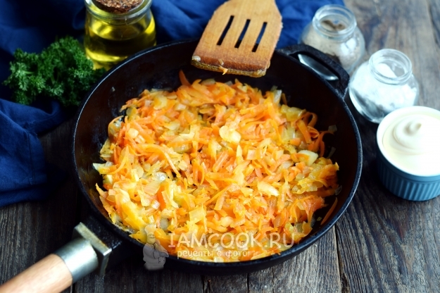 На конфорку установите сковороду, влейте масло, после разогрева загрузите шинковку лука. Лук обжаривайте отдельно 1 минуту, после закиньте к нему полоски моркови. Овощи пассеруйте в масле до мягкости следующие 5 минут на среднем огне.
