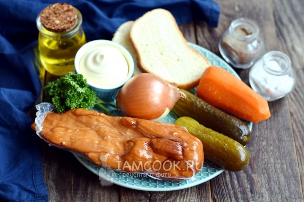 Продукты для приготовления салата «Обжорка» с копченой курицей и сухариками подготовьте по списку. Овощи тщательно вымойте, протрите полотенцем.