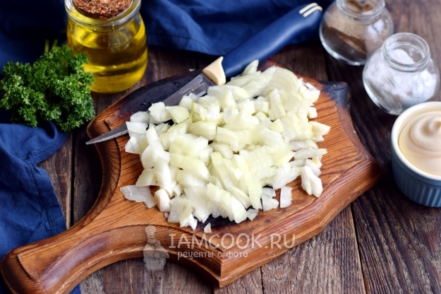 Головку репчатого лука отделите от шелухи, настрогайте кубиками среднего размера.