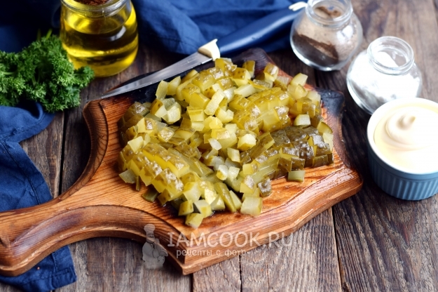 Соленые огурцы отожмите от маринада, нарежьте небольшими кубиками. Сок, который выделится при нарезке, слейте.