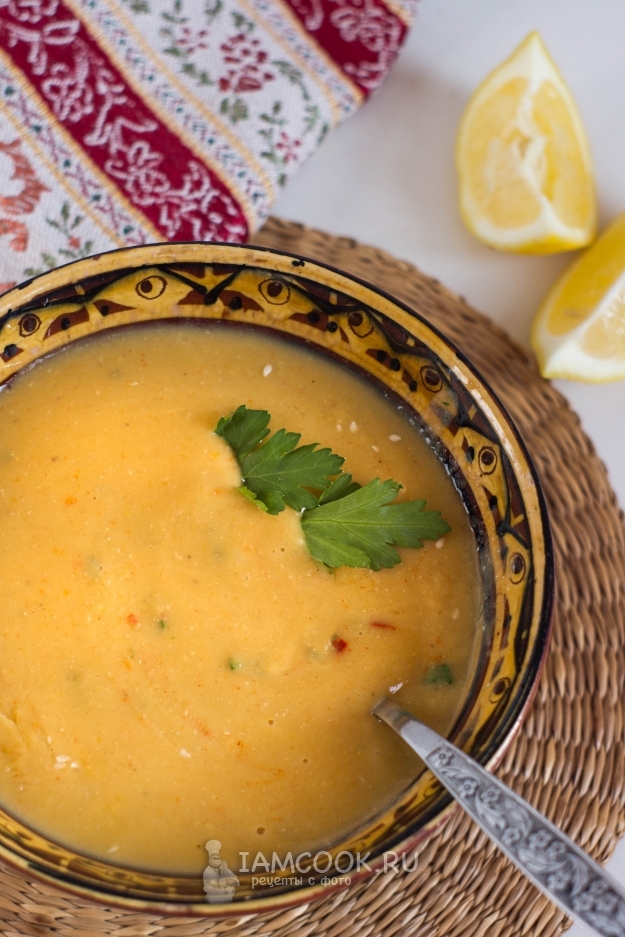При подаче дополните мерджимек чорбасы (турецкий суп-пюре из чечевицы с лимоном) свежей зеленью на свой вкус, пряностями, семенами кунжута, сухариками.