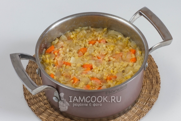 На дно кастрюли налейте растительное масло, добавьте измельченные лук и морковь. Обжаривайте, помешивая, до подрумянивания.