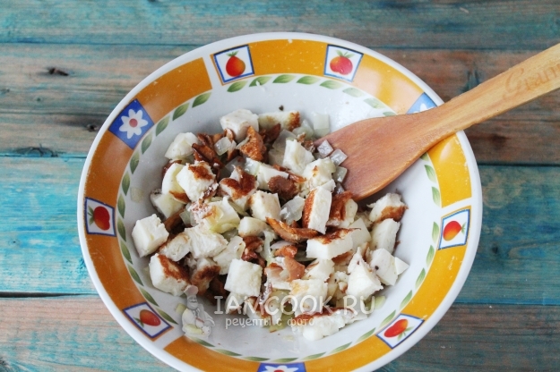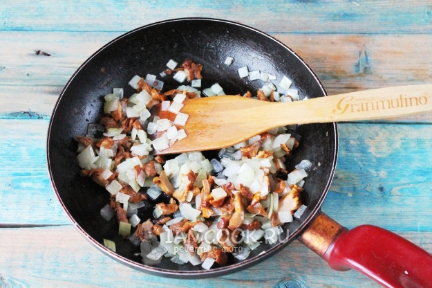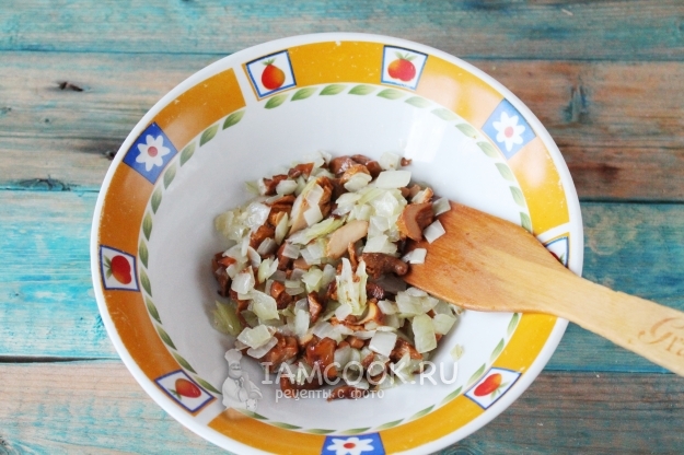 На подсолнечном масле поджарим мелко нарезанный репчатый лук, добавим грибы.