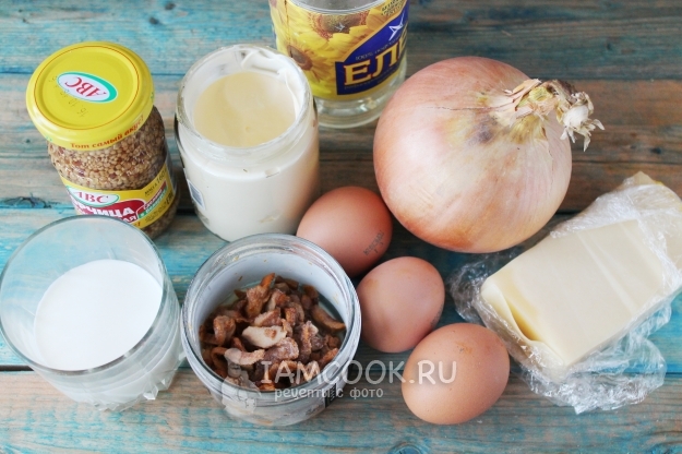Итак, приступим. Продукты для салата с омлетом и грибами возьмем по списку.