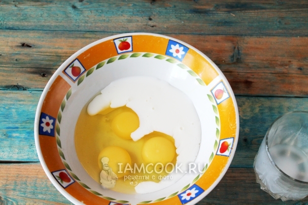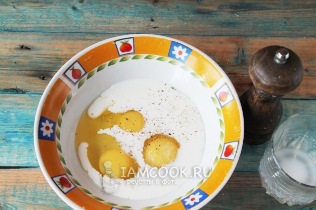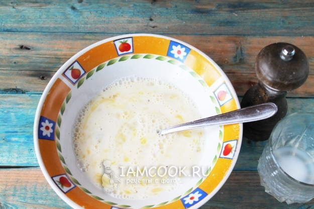 В глубокую миску разобьем яйца, посолим, вольем молоко.