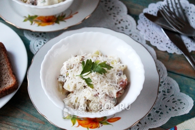 Сверху насыплем тертый сыр. Салат с омлетом и грибами готов. Сразу подаем!