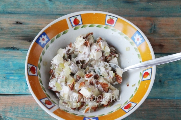 Грибы можно использовать любые, но именно с жареными салат получается наиболее вкусным и сытным. У меня - заготовка из жаренных на сливочном масле лисичек, можно взять любые свежие или замороженные грибы и поджарить их перед приготовлением салата с луком. Вкус салата с маринованными или солеными грибами будет совершенно другим, но тоже довольно необычным и достойным внимания. Постараюсь приготовить его позже.
