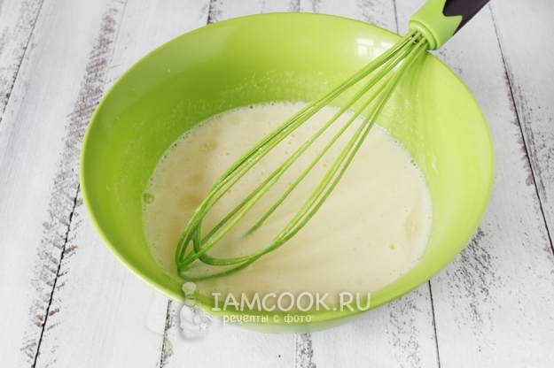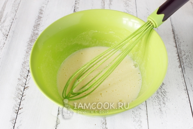 Вбиваем в глубокую миску яйца и всыпаем сахар, взбиваем венчиком или миксером до растворения сахара и образования пышной массы. Я использовала силиконовый венчик и усиленно взбивала ровно 2 минуты.
