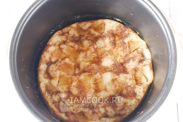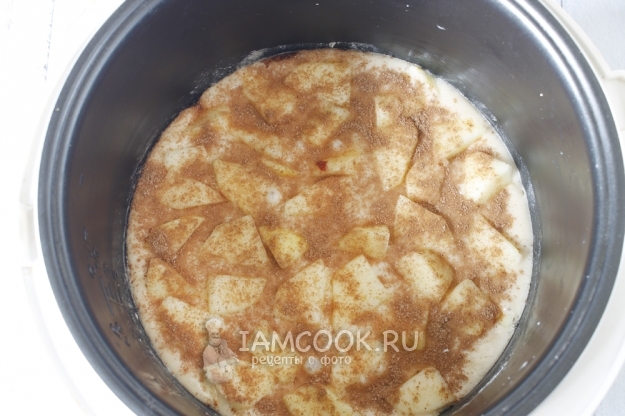 Включаем мультиварку, ставим режим "выпечка", ждем, пока она немного прогреется. Смазываем дно и немного бока чаши мультиварки сливочным маслом, присыпаем мукой. Высыпаем половину подготовленных яблок, выливаем тесто, равномерно его распределяя, и выкладываем вторую часть яблок. Сверху посыпаем смесью сахара и корицы. И заново включаем режим "выпечка" на 55 минут. В моей мультиварке режим рассчитан на 45 минут, так что я потом еще добавила 10 минут.