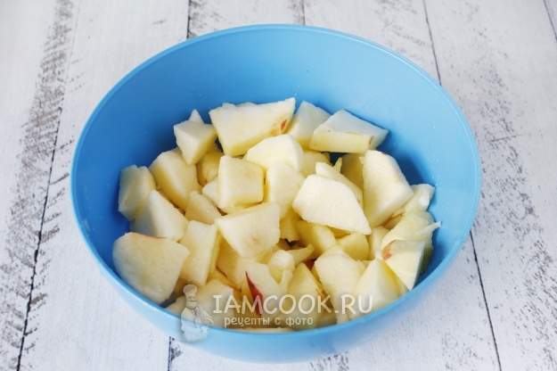 Яблоки моем, очищаем от кожуры и сердцевины и нарезаем кусочками средней величины. Высыпаем их в миску и сбрызгиваем лимонным соком - понадобится примерно 1 столовая ложка сока, перемешиваем.