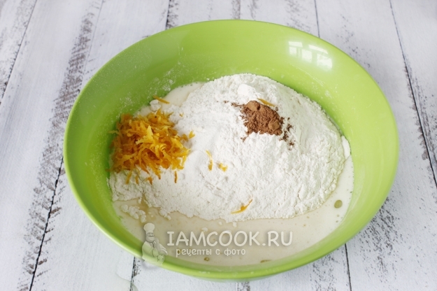 Теперь всыпаем в миску просеянную муку, соль, корицу и разрыхлитель. Также добавляем цедру лимона, натертую на мелкой терке.