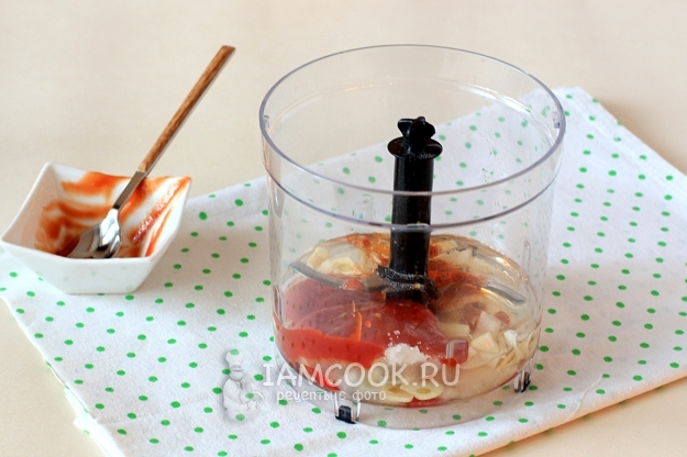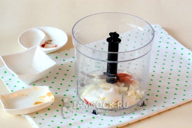 Все сухие составляющие - сахар, соль, паприку, перец, горчицу - положите в чашу блендера вместе с луком и чесноком.