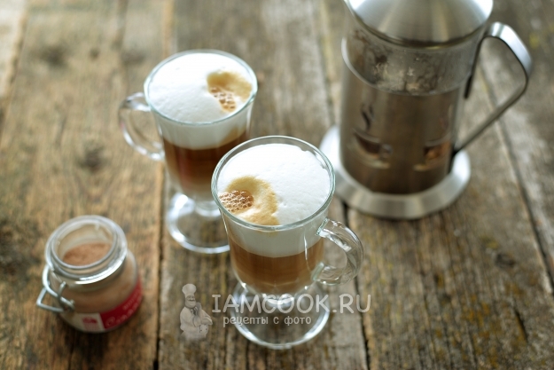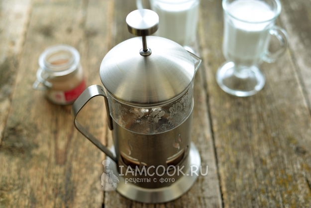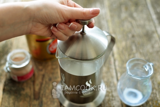 Первым делом нам нужно взбить молоко в пену, и пока она будет оседать, заварите кофе. Итак, поставьте молоко в микроволновку или просто подогрейте его на плите до горячего состояния. Чтобы молоко взбилось, оно должно быть пастеризованным и не менее 2,8% жирности. Перелейте горячее молоко в чашу френч-пресса, накройте крышкой и интенсивными движениями начните взбивать его с помощью поршня. Буквально через несколько секунд молоко увеличится в объеме и станет воздушным.