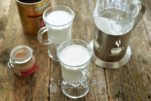 Разлейте молоко по высоким стаканам с ручками, отставьте пока в сторону, чтобы оседала пена, а пока заварите кофе.