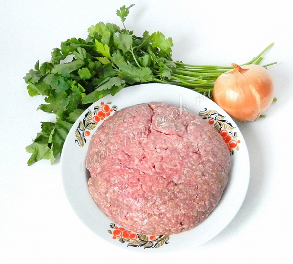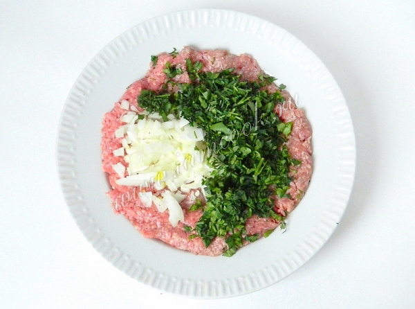 Лук и петрушку максимально измельчаем и добавляем в фарш.