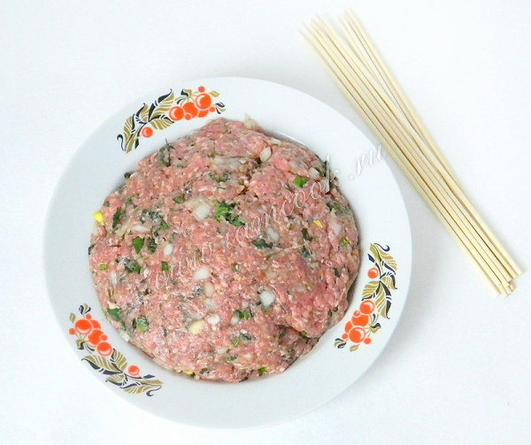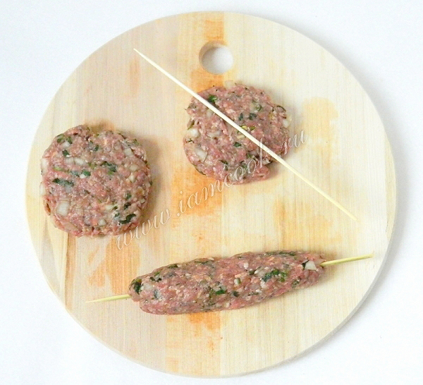 Все хорошо перемешиваем и отбиваем кулаками, можно фарш с силой бросать на разделочную доску. Нам нужно добиться вязкости фарша. Подготавливаем деревянные шпажки. Лучше предварительно замочить их в воде на 20-30 мин.