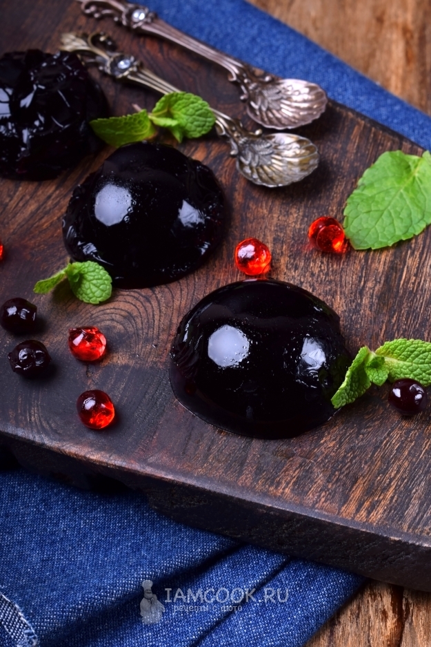 Вот такой интересный цвет у желе из черники, похож на черную жемчужину. Консистенция неплотная, желе немного дрожит, если потрясти тарелку, вкус - в меру сладкий, не приторный.