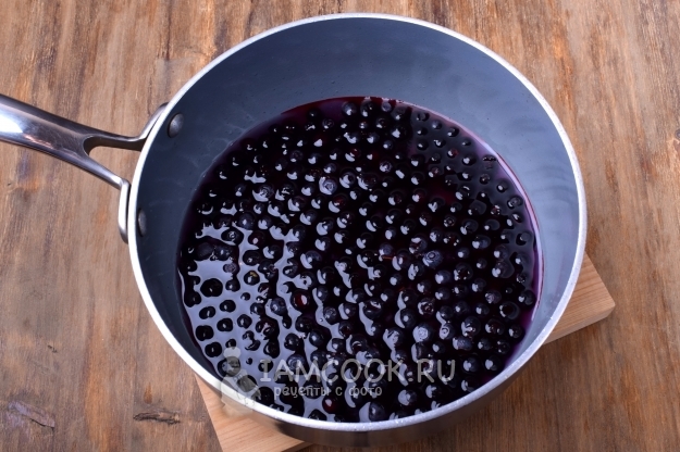 В сотейник нальем воду (250 мл), добавим сахар и доведем до кипения, прокипятим 1 минуту, чтобы сахар растворился, затем добавим замороженную чернику. Еще раз доведем смесь до кипения и проварим 2-3 минуты. На последней минуте варки добавим ванилин.