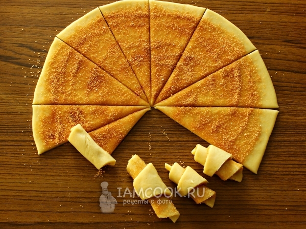 Делим тесто на 3 части, можно и на 4, но тогда рогалики будут маленькими. Каждую часть поочередно раскатываем в тонкую круглую лепешку. Посыпаем сахаром и корицей по вкусу и разрезаем на сегменты. Каждый сегмент скручиваем от широкой части к узкой.
