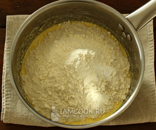 Сливочное масло растапливаем, остужаем до теплого. Добавляем яйцо и сметану, перемешиваем до однородности.