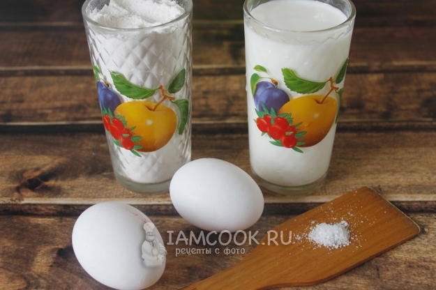 Вот такой скромный набор продуктов нам понадобится, плюс сливочное масло. Молоко и яйца заранее достаем из холодильника, чтобы они не были холодными, а то тесто не удастся.