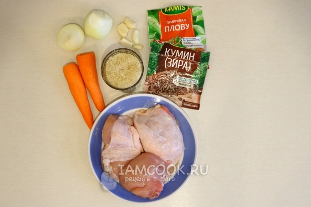 Итак, для приготовления рассыпчатого плова с курицей в мультиварке нам потребуется длиннозерный рис и куриное мясо - мне приглянулись бедрышки, но можно использовать любую часть птицы, будь то филе или голени. Из овощей беру лук, морковь и чеснок, из специй - приправу к плову и зиру. Последнюю я очень люблю и использую дополнительно, несмотря на то, что она содержится в основной приправе. Соль и перец - по вкусу, но я ни то, ни то другое не использовала.