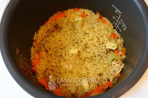 Закрываем крышку мультиварки и готовим около 15 минут до полного впитывания жидкости. После чего аккуратно перемешиваем плов и оставляем ещё на 10-15 минут настояться в уже выключенной чаше.
