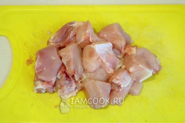 Куриные бедра промываем, очищаем от кожуры и по возможности разрезаем на крупные куски.