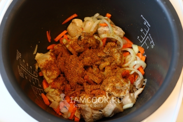 Добавляем к мясу растительное масло, перекладываем овощи в мультиварку, а также всыпаем приправу для плова.