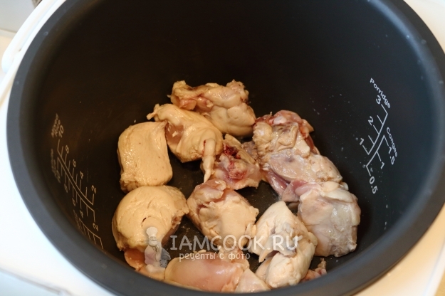 Разогреваем мультиварку в режиме "Выпечка" и выкладываем курицу. Готовим 20 минут с открытой крышкой - до выпаривания мясной жидкости.