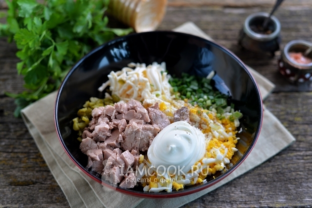 Зеленый лук и корнишоны или маринованный огурчик мелко нарежьте, переложите все в миску.