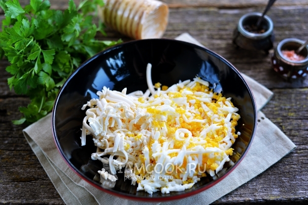 Плавленый сырок натрите на терке вместе с яйцами, сложите их в глубокую миску.