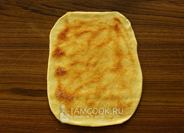 Раскатываем первую часть теста в прямоугольный пласт, смазываем растительным маслом и посыпаем сахаром и корицей.