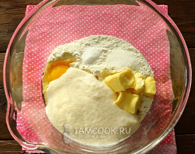 В миску для замеса теста добавляем муку, ванильный сахар, соль, сливочное масло, яйцо и белок от второго яйца (желток пойдет для смазывания пирога). Вливаем опару и замешиваем тесто.