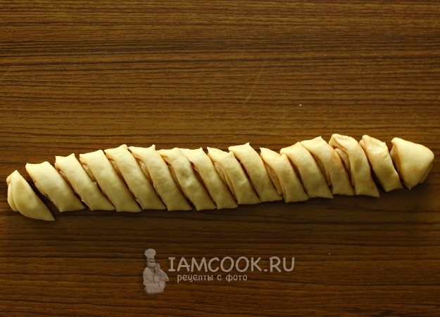 Сворачиваем в рулет по длинной стороне. Затем острым ножом наискосок нарезаем на кусочки шириной примерно 1 см.