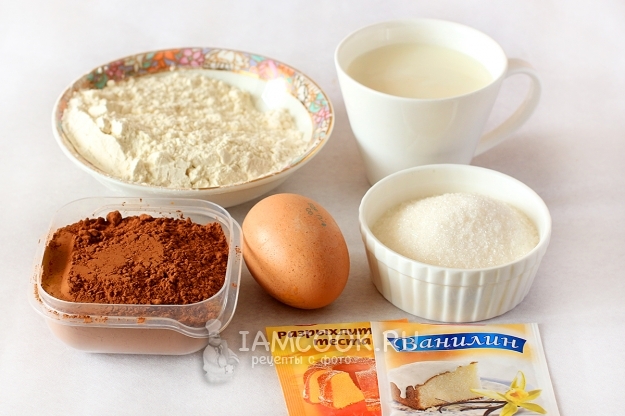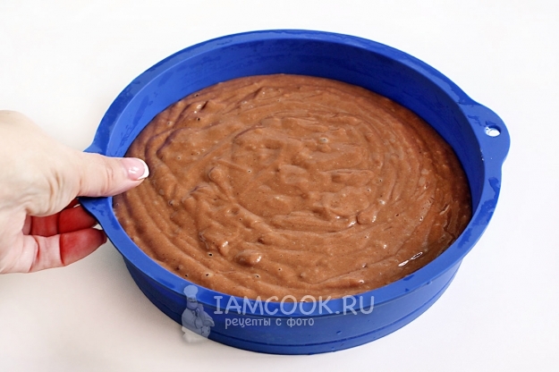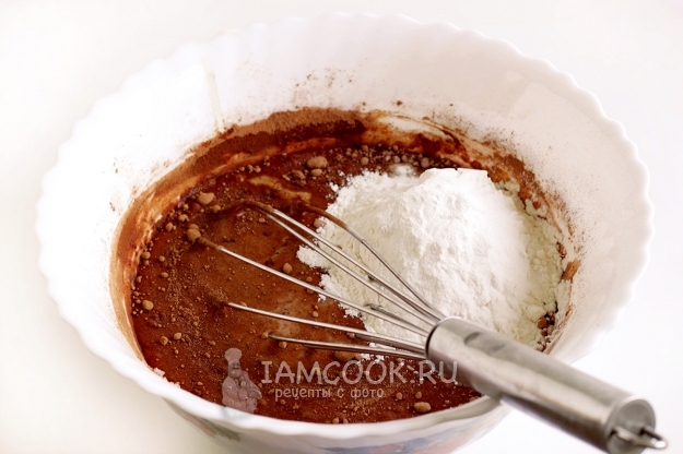 Добавить какао, а также муку с разрыхлителем и ванилином. Смешать однородное жидкое тесто. Дать ему немного постоять, минут 10.