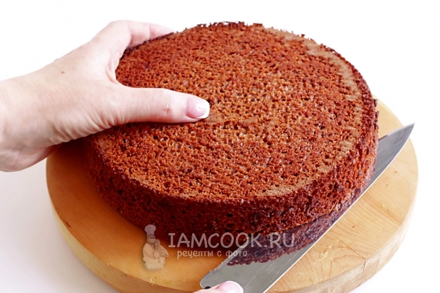 Остывший бисквит разрезать на два коржа. Нижний корж сделать очень тонким, а верхний - толстым. Верхний корж нарезать на квадратики.